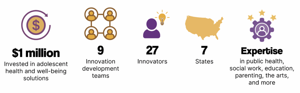 Across our two cohorts, we invested $1 million in solutions focused on adolescent health and well-being, helping nine innovation development teams develop and scale bold new approaches. The 27 innovators leading this work represent seven states and bring expertise in public health, social work, education, parenting, the arts, and more. Although their innovations and backgrounds vary, they are united by a shared commitment to break through the status quo and build a world where young people are served by solutions that are truly responsive to their needs.